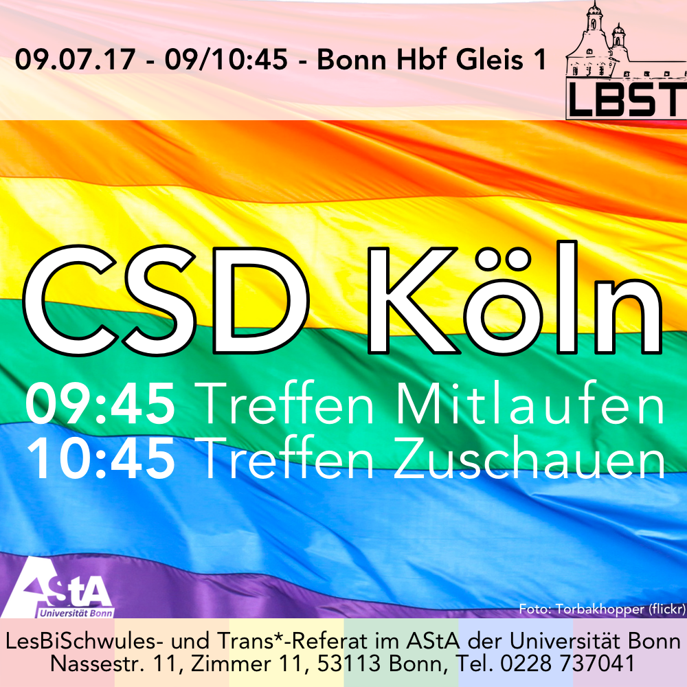Wie jedes Jahr besuchen wir mit euch den CSD Köln. Wer mit uns und dem Kölner Referat LUSK in der Demonstration mitlaufen möchte, kann sich um 09:45 am Gleis 1 des Bonner Hbf einfinden. Wer mit unserer Gruppe zum Zuschauen am Rand stehen möchte, trifft sich um 10:45.