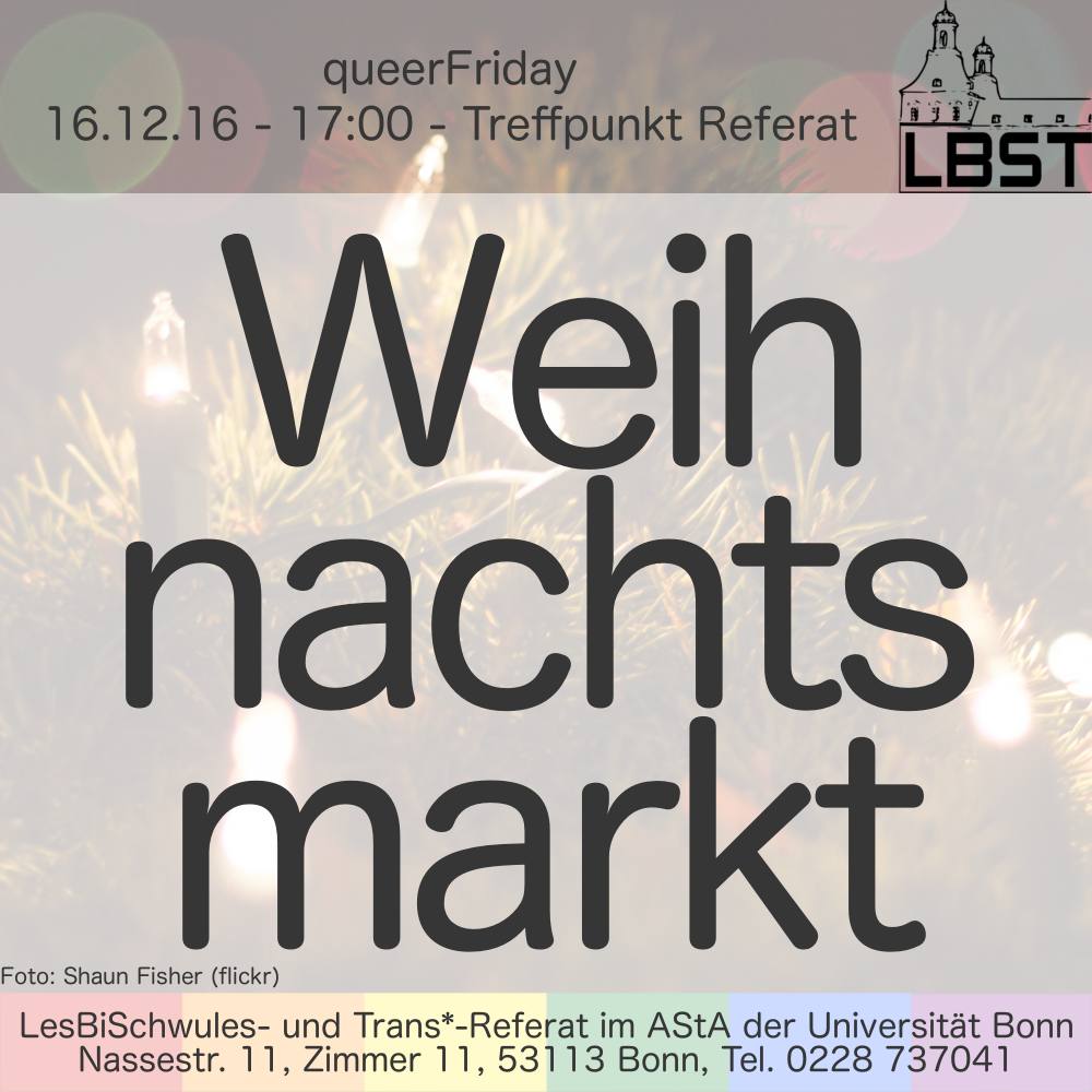 Glühwein und heiße Schokolade locken uns diese Woche auf den Bonner Weihnachtsmarkt! Treffpunkt ist ab 17:00 das Referat um später gemeinsam loszuziehen.