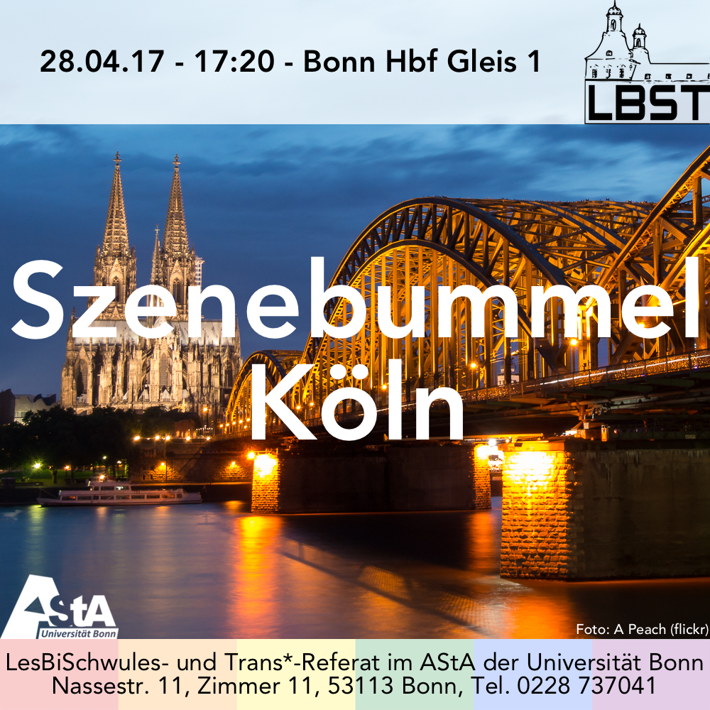 Gemeinsam mit dem Kölner Referat LUSK führen wir euch durchs Kölns bunte queere Szene. Treffpunkt für die Fahrt nach Köln ist um 17:20 Bonn Hbf Gleis 1.